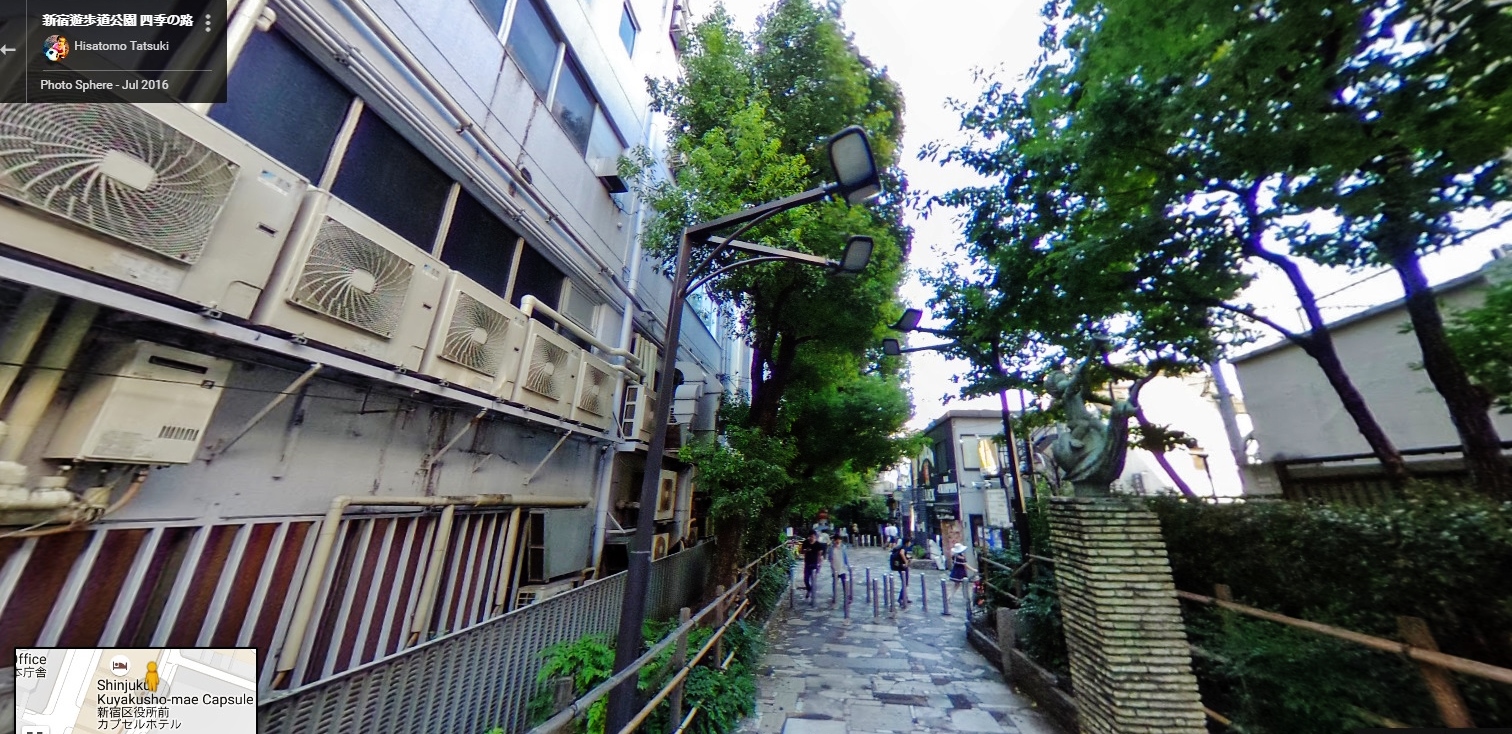 A view of Shinjuku Esplanade Park 「新宿遊歩道公園四季の道」, a green “S” that cuts through the drab Shinjuku cityscape. It was built in 1974 following the removal of the Toden streetcar. See: From train to tree: Golden Gai, Toden streetcar, and Shinjuku Promenade Park
