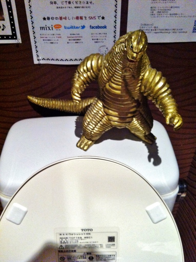 There is/was a gold Godzilla (or Mecha-Godzilla メカゴジラ?) in the bathroom of the wonderful Ushi-Tora bar in Shimo-Kitazawa. The bar has since moved.