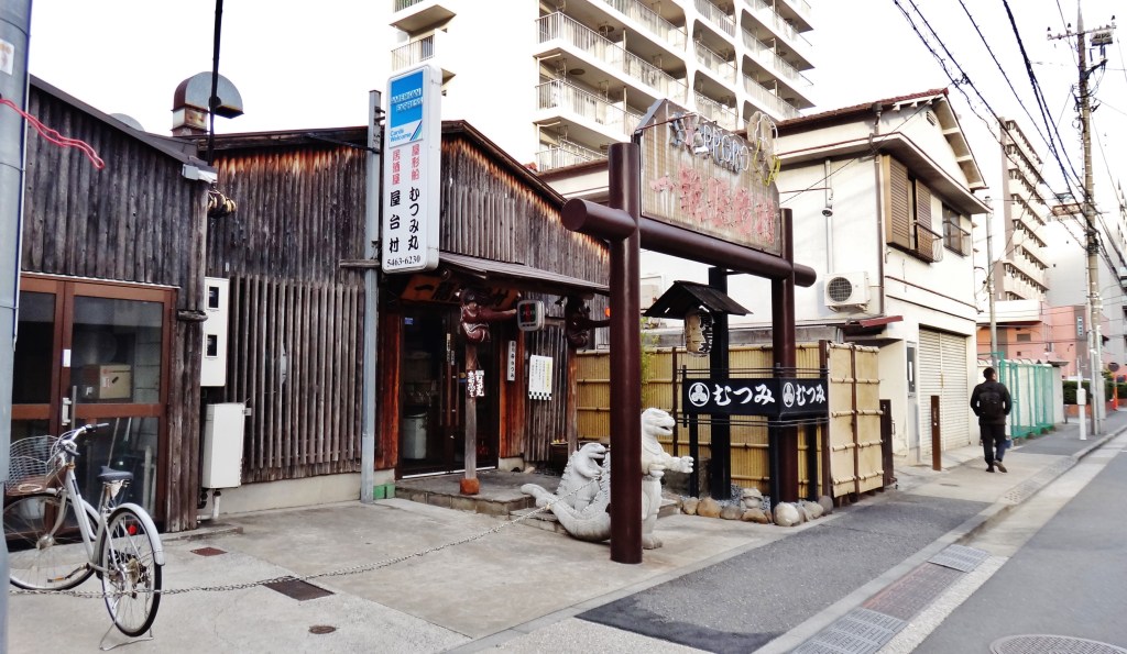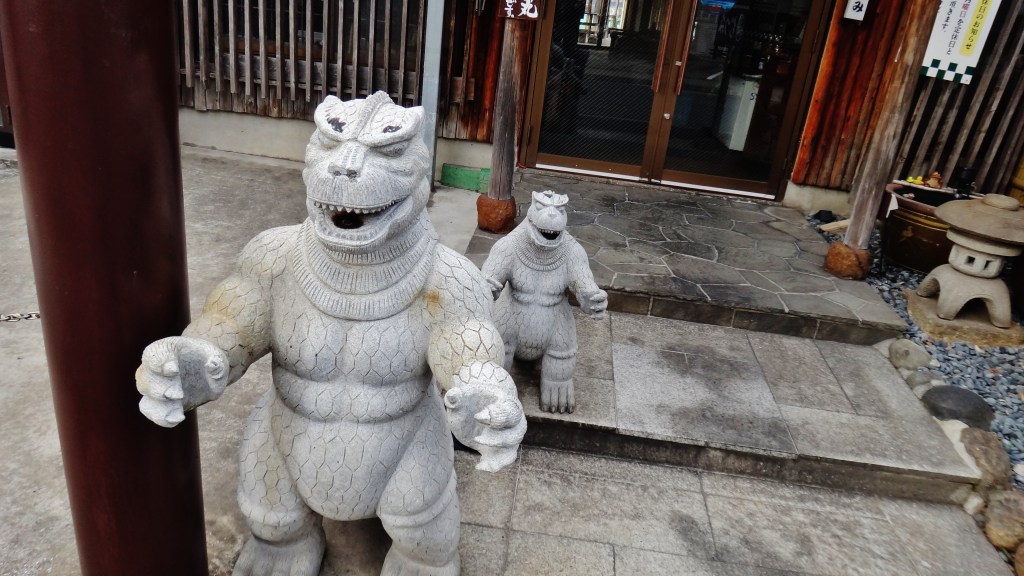 In the old fishing village of Higashi-shinagawa is a Yakatabune restaurant named Shinagawa Yakatabune Mutsumimaru 品川 屋形船 むつみ丸. Guarding the establishment are two stone Godzilla statues. This is no random location; “in fact”, Godzilla first steps foot onto Tokyo’s shores at this location in some of the films. (It may only be the location for Shin Godzilla シン・ゴジラ). See: ゴジラの“足跡”たどる 初代が上陸した品川 Godzilla’s “footprints” traced Shinagawa where the first generation landed