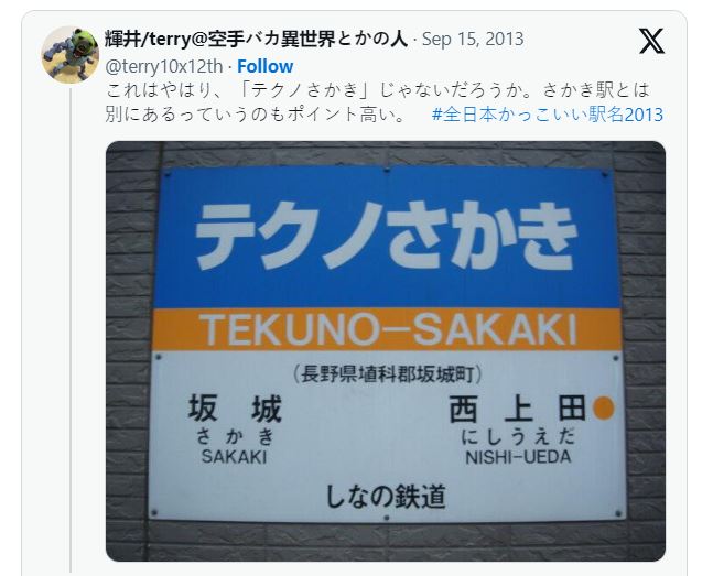 • Tekuno-Sakaki Station テクノさかき駅: nearby is the Sakaki Techno Center 坂城テクノセンター. The official romanization of the word  テクノ is “Tekuno”; there is a note of caution on the company website that says “not techno“. Photo: