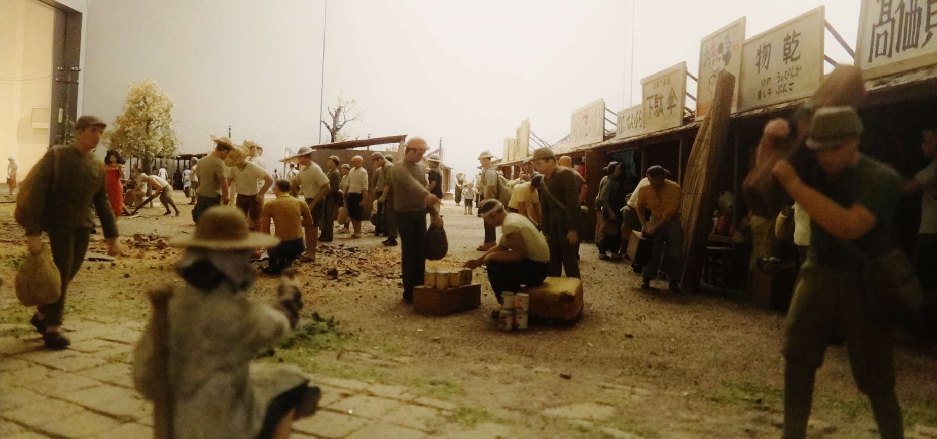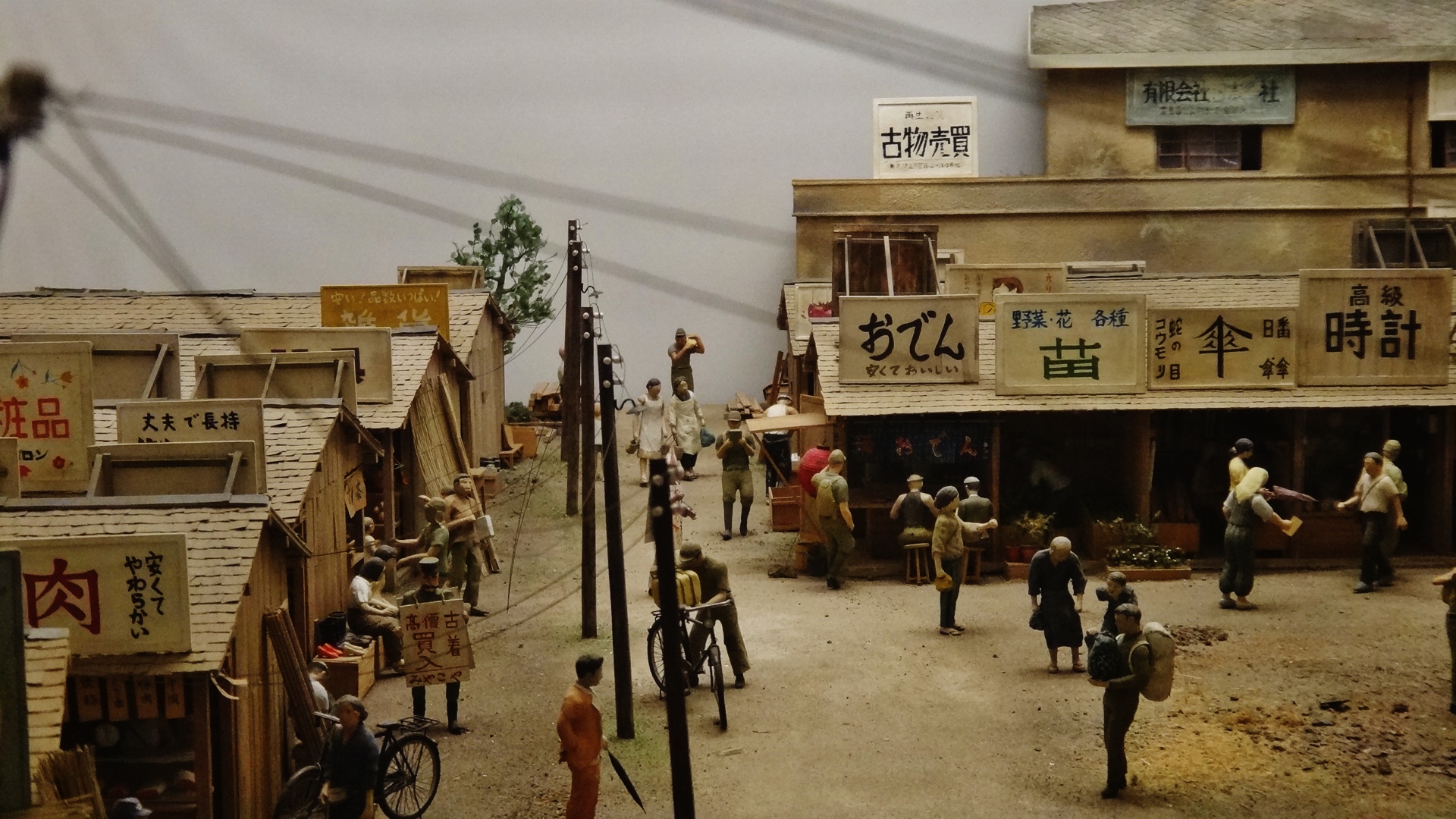 “After World War II, in order to provide food and daily necessities to war-damaged cities such as Tokyo, so-called black market cities (yami-ichi) emerged. Ikebukuro, a key transportation hub, became a typical black market city. The museum has a model of the southern part of Ikebukuro’s black market city at the scale of 1 to 20.”