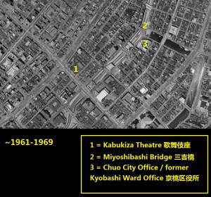 A section of the Ginza area circa 1960s, after the canals in this area were filled-in. Indicated in the photo are: