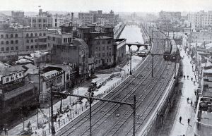 View of the Yamanote line tracks next to the old Edo-era canal that used to flow through this area. We are facing south; Ginza is to the left (east) and Imperial Hotel & Hibiya Park are to the right (west). See: The Canals of Ginza: floating through time on Tokyo’s central waterways