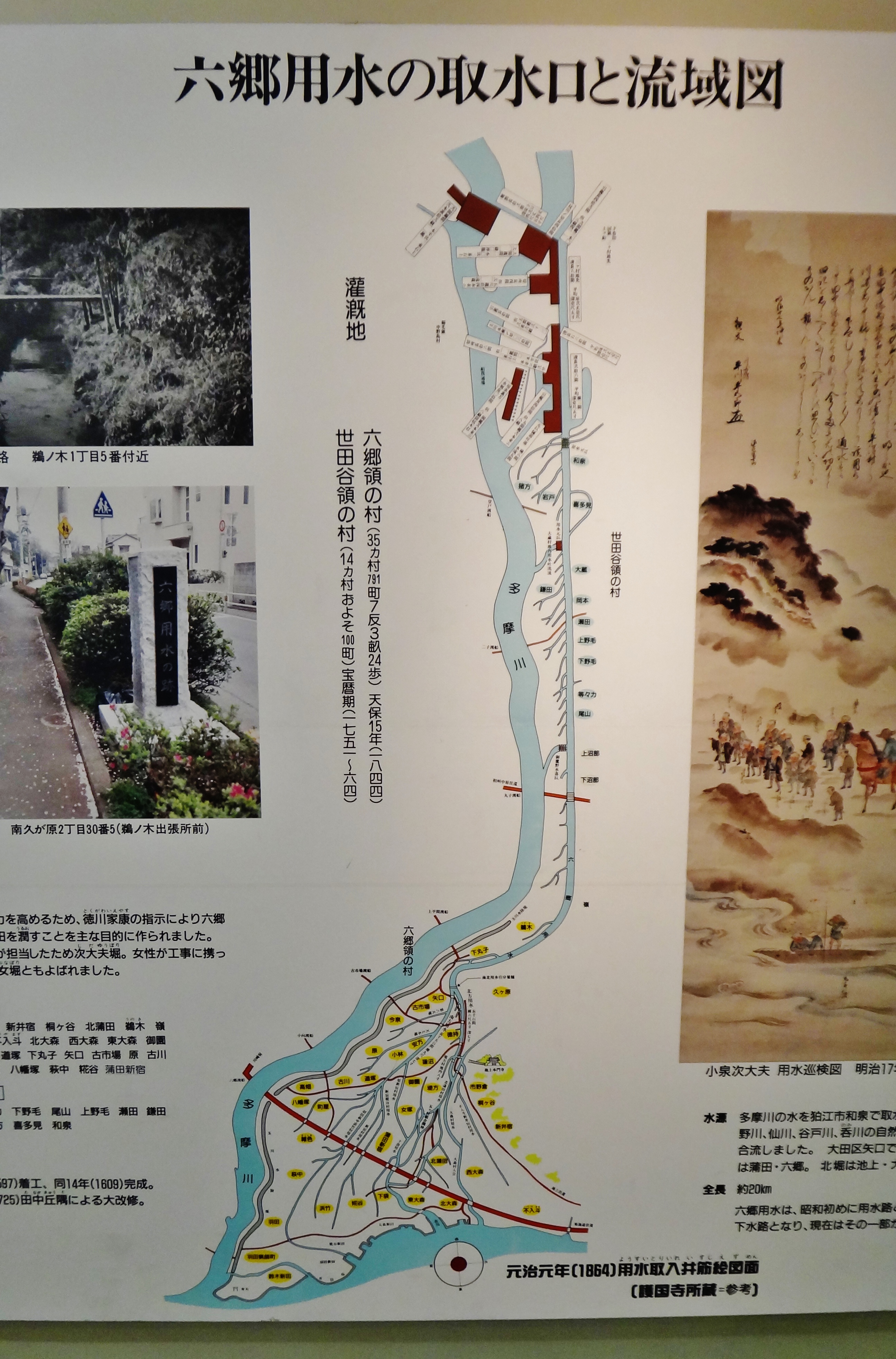 Map from the Ota-ku museum: Rokugo Canal water intake & drainage map 六郷用水の取水口と流域図: