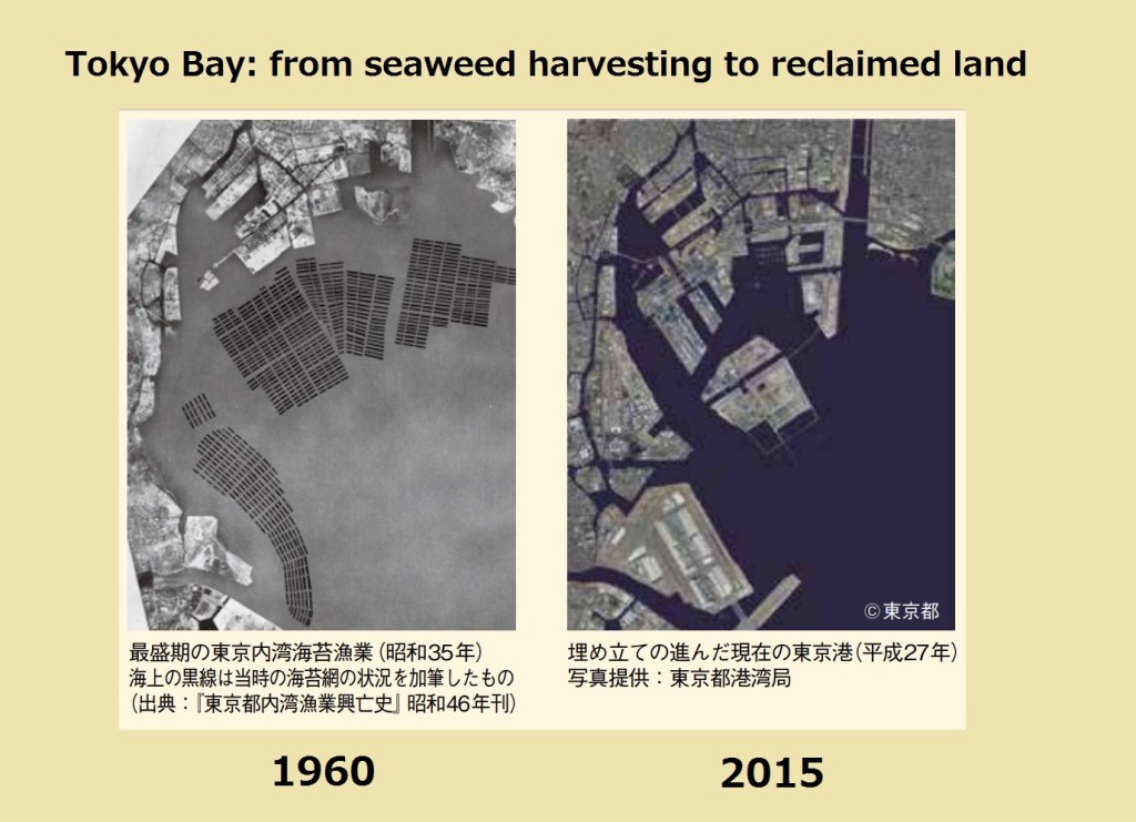 Here’s a dramatic comparison of Tokyo Bay between 1960 and 2015 (source). The extent of the nori farming in 1960 is almost unimaginable (the hash marks in the photo at left are all nori nets 海苔網):