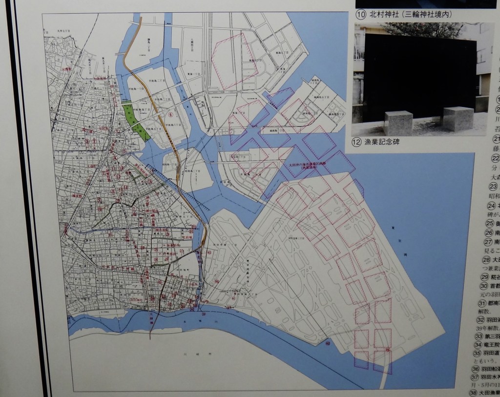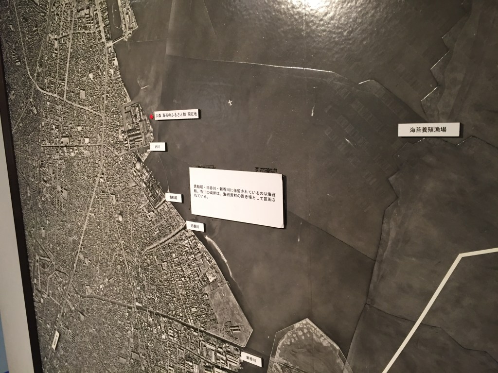 The Ota-Ku Local History Museum 大田区立郷土博物館 also has a room dedicated to the history of Ota-ku’s nori farming; it overlaps with the Omori Nori Museum, but it’s worth a visit. Seen here is a map of the nori farming locations superimposed over the location of the expanded Haneda Airport. Also shown here are nori farming artifacts and photos.