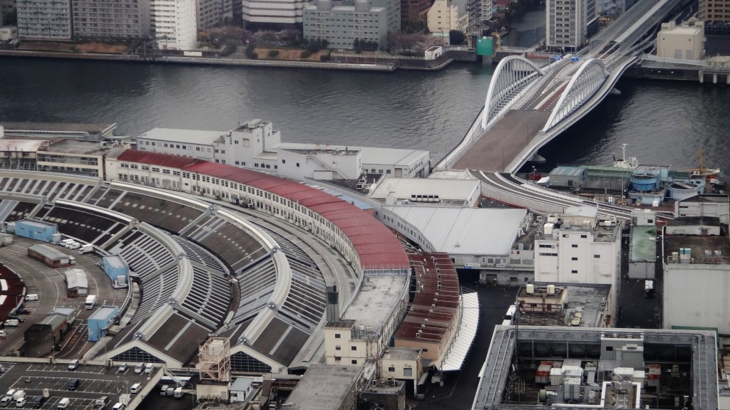 In the above picture, Tsukiji Market’s curved shape is instantly recognizable, with the Sumida River behind it. The relatively new Tsukiji Ohashi 築地大橋 bridge (it opened in 2018) crosses the river towards Kachidoki.