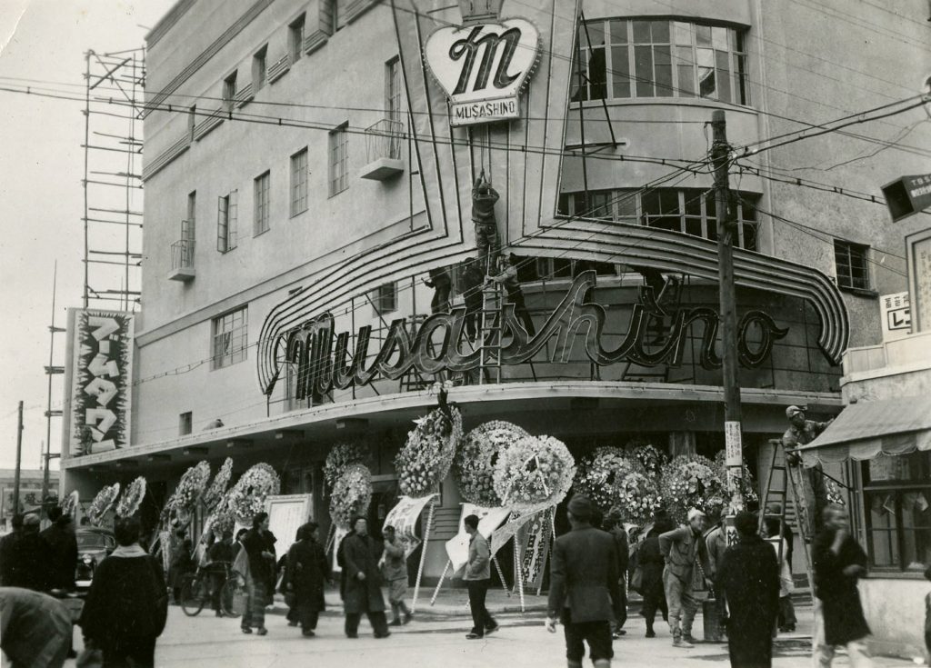 Also of note on page 145 is that Tokyo’s first neon sign was Musashino Cinema (Shinjuku Musashino-kan), built in 1926. (According to another source, the original Mushashino was built in 1920 and moved to the new location in 1928; either way, it is important to the history of Japanese movie-going. In 1929 it became the first permanent theater in Japan to show ‘talkies’.) Photos of the Musashino Theater from 1936 and from 1947: