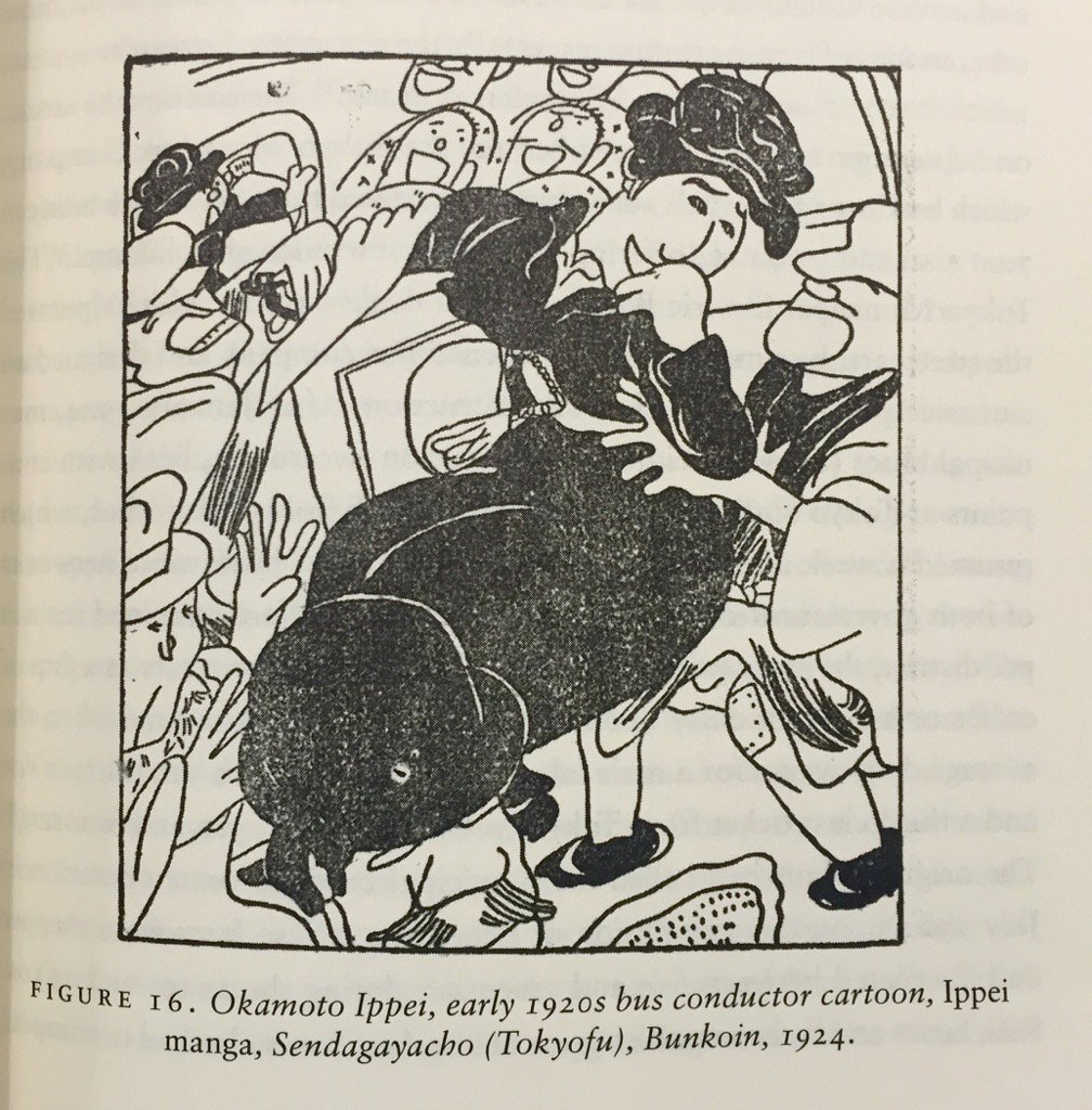 (From the book: 1924 cartoon by Ippei Okamoto depicting a female bus conductor harassed by riders.)