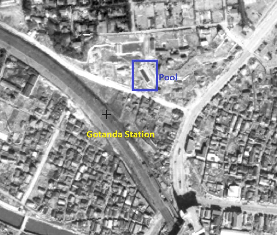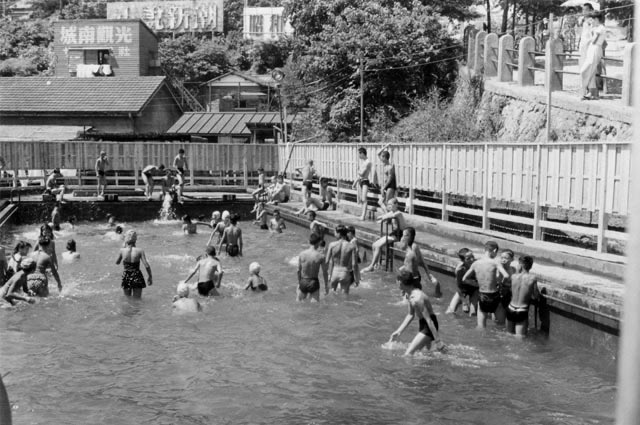 Came across this great photo (source) of children swimming in a pool in the hill north of Gotanda Station: