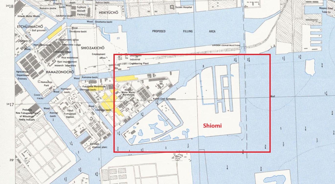 Shiomi is visible in the following map from 1945, but it is clear there are no roads or buildings (source: Sheet 13), which is consistent with its use as a landfill: