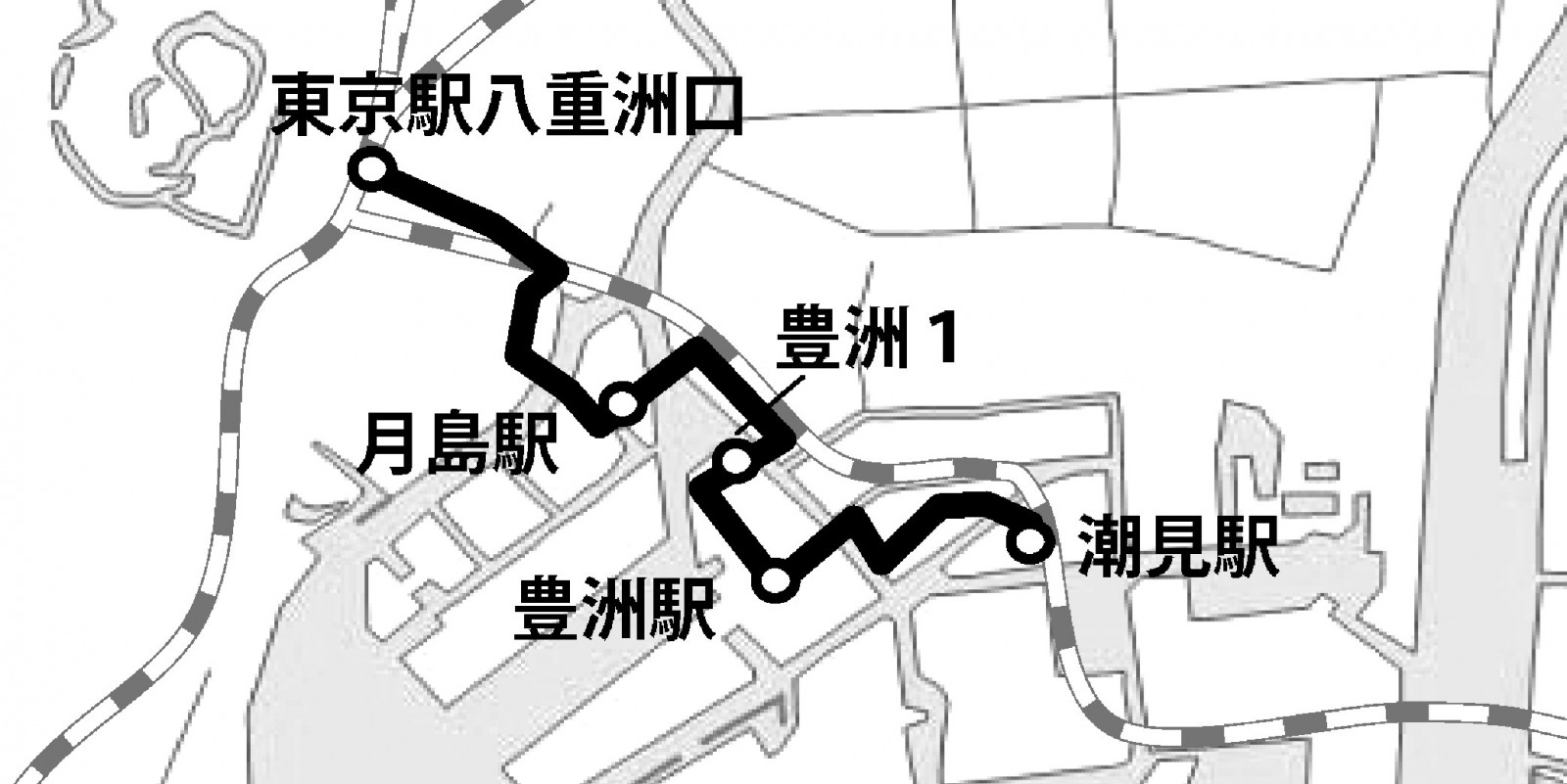 How did people get to Shiomi back in the day? Bridges reached the island as far back as the 1960s. According to the Toei Bus Museum, it appears that Shiomi was serviced by bus 東17 (East 17), starting in 1972. The following map shows the route from Tokyo Station in the west, terminating at Shiomi Station in the east.