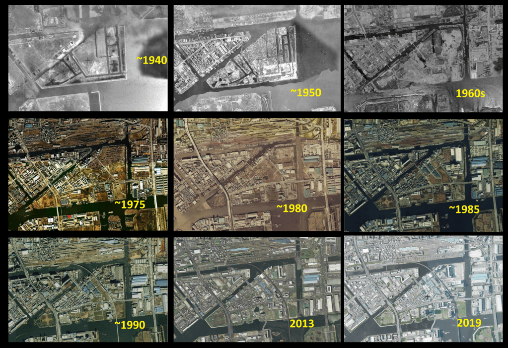 Aerial view time series of Shiomi island, Koto-ku (adapted from GSI 地理院地図):