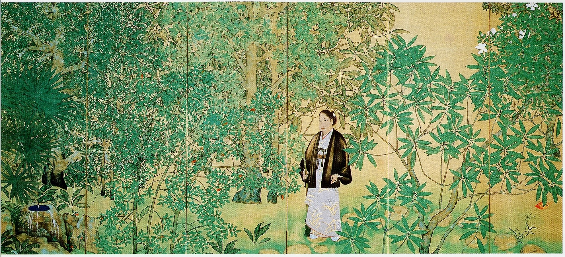 A woman in a bamboo grove, in a work of art from the Kodansha Noma Memorial Museum 講談社野間記念館.