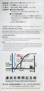 Kodansha museum map information Tokyo Brochure for the Kodansha Noma Memorial Museum 講談社野間記念館, including address, open hours, and contact information. Share this: Click to share on Facebook (Opens in new window) Facebook Click to share on X (Opens in new window) X Click to share on Tumblr (Opens in new window) Tumblr Click to share on Reddit (Opens in new window) Reddit Click to share on Pinterest (Opens in new window) Pinterest Click to email a link to a friend (Opens in new window) Email Click to print (Opens in new window) Print Click to share on Pocket (Opens in new window) Pocket Click to share on LinkedIn (Opens in new window) LinkedIn Like Loading...