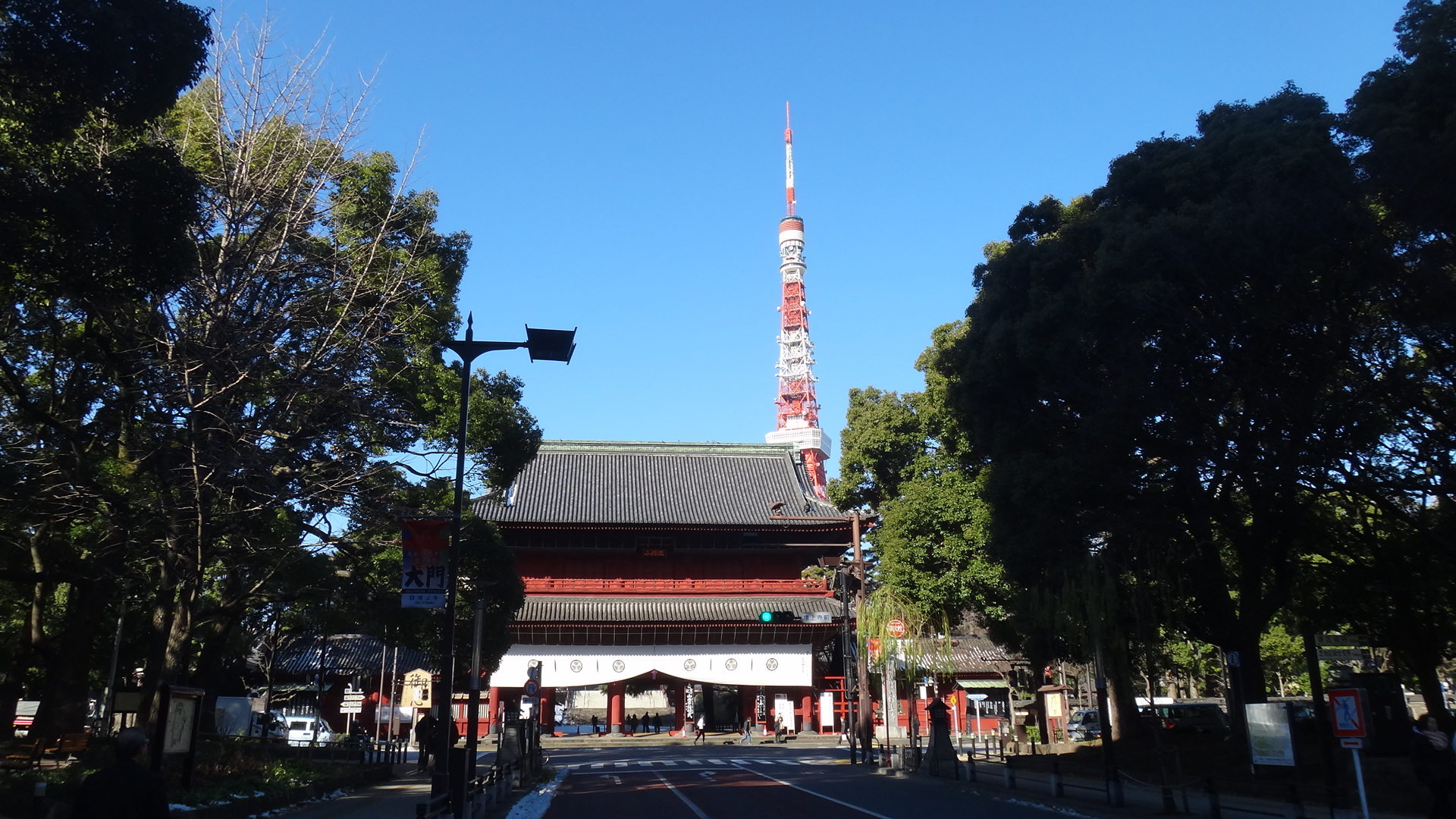 A view of Tokyo Tower peering over Zojoji Temple 三縁山増上寺, near Daimon Station. See: Thirty-six views of Tokyo Tower 東京タワー三十六景